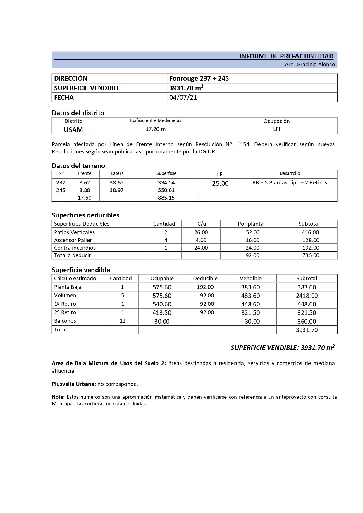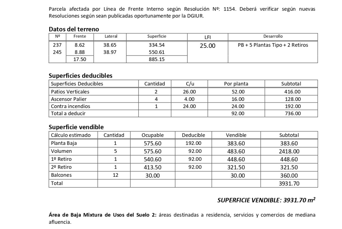Lote con doble frente de terreno y medianera lindera a espacio verde. Apto para desarrollo de escala media según el nuevo Código Urbanístico de CABA – Distrito USAM. Apto para desarrollo de PB + 5 Plantas Tipo + 2 Retiros. Incluye informe de prefactibilidad profesional emitido por Arq. Graciela Alonso.